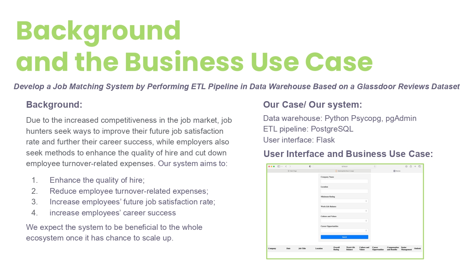 It developed and optimized an ETL pipeline using PostgreSQL to efficiently manage and process job review data.