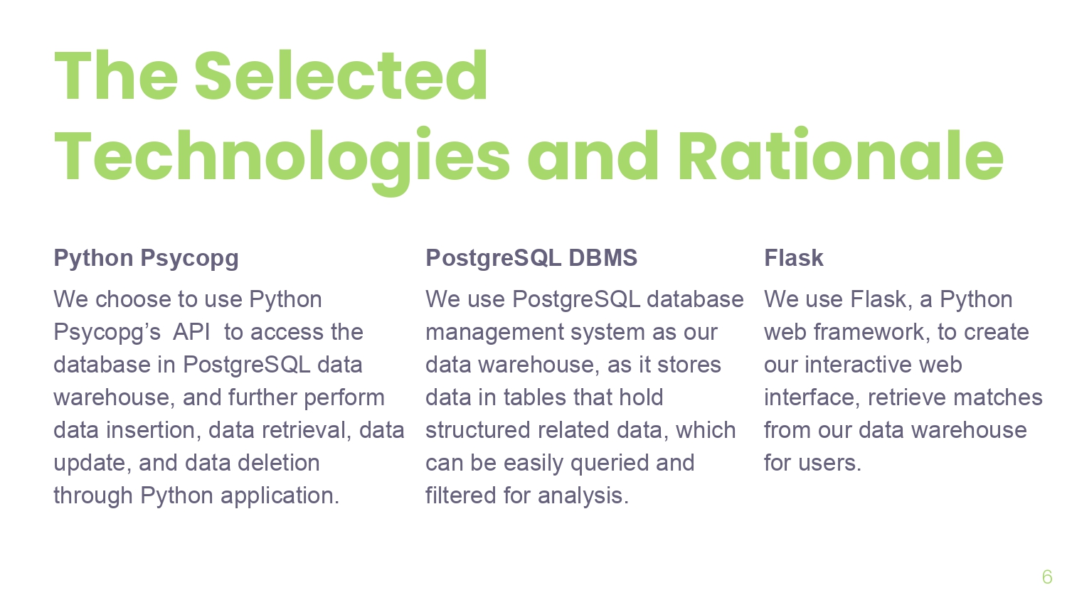 Integrated Python Psycopg for robust database interactions, enhancing data retrieval and update operations within the PostgreSQL environment.